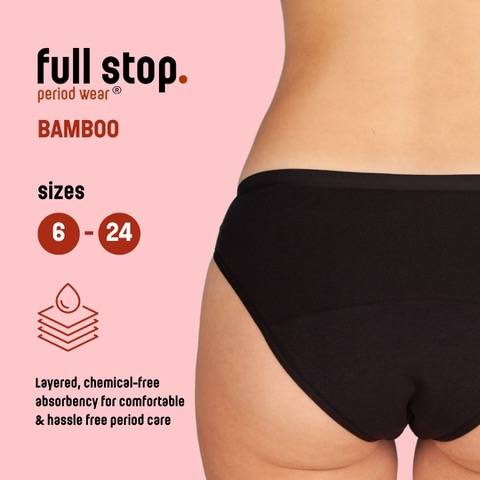 Made for comfort while maximising confidence—Full Stop Bamboo Period Pants are your perfect partner for a reliable and eco-conscious period. With a sleek bikini cut and ultra-soft stretchy bamboo fabric, these reusable period pants absorb up to 8 tampons (40ml) with no drama.
